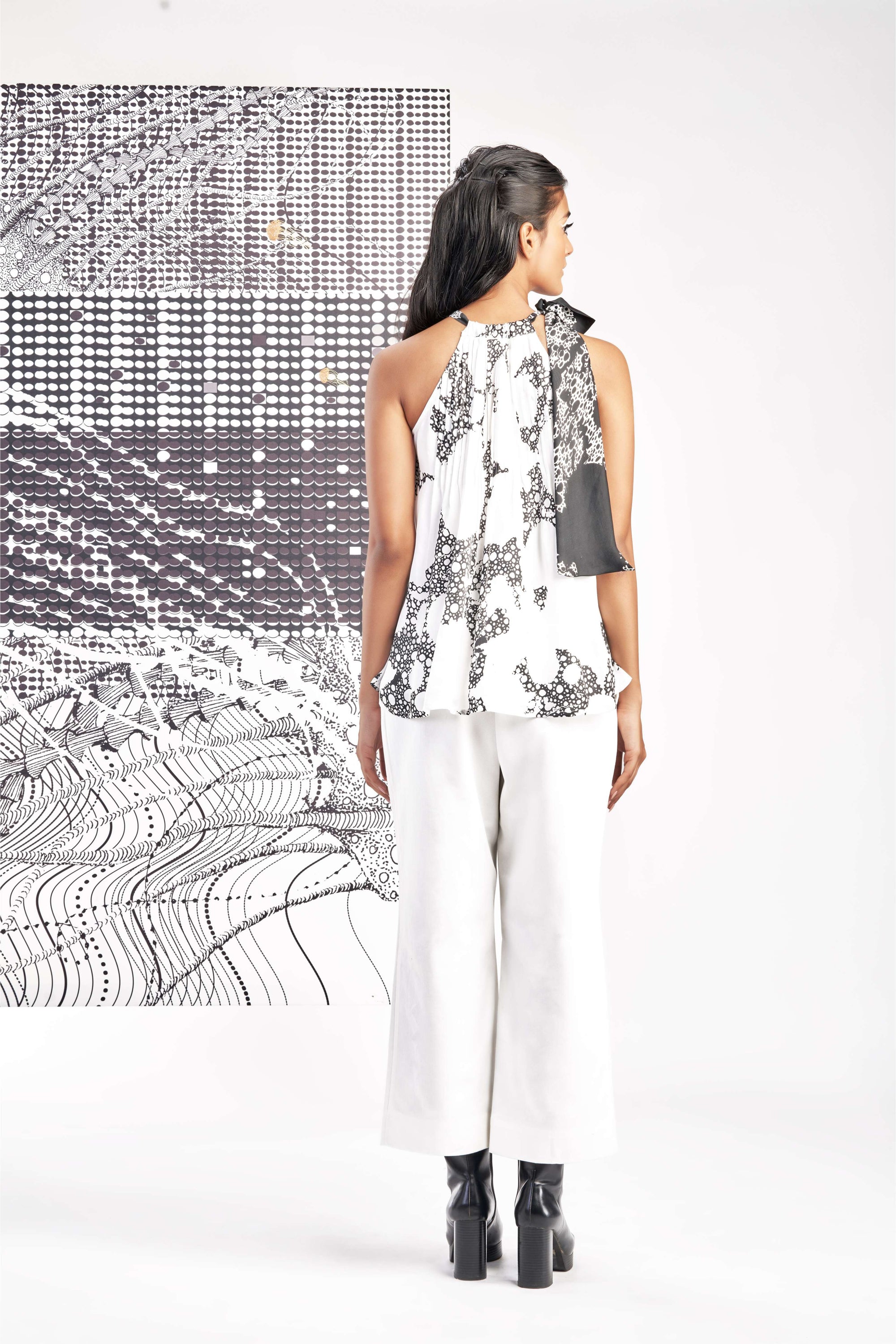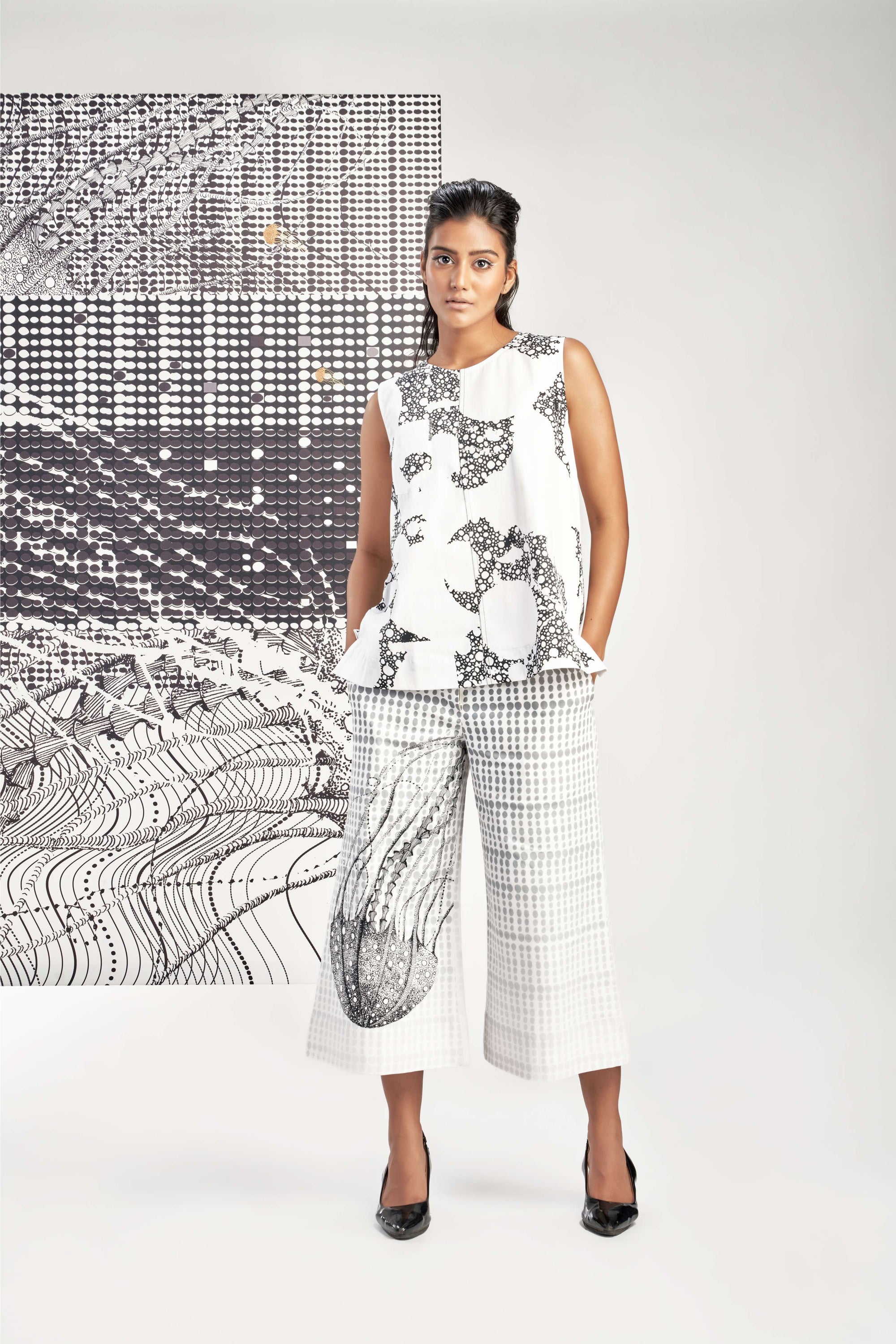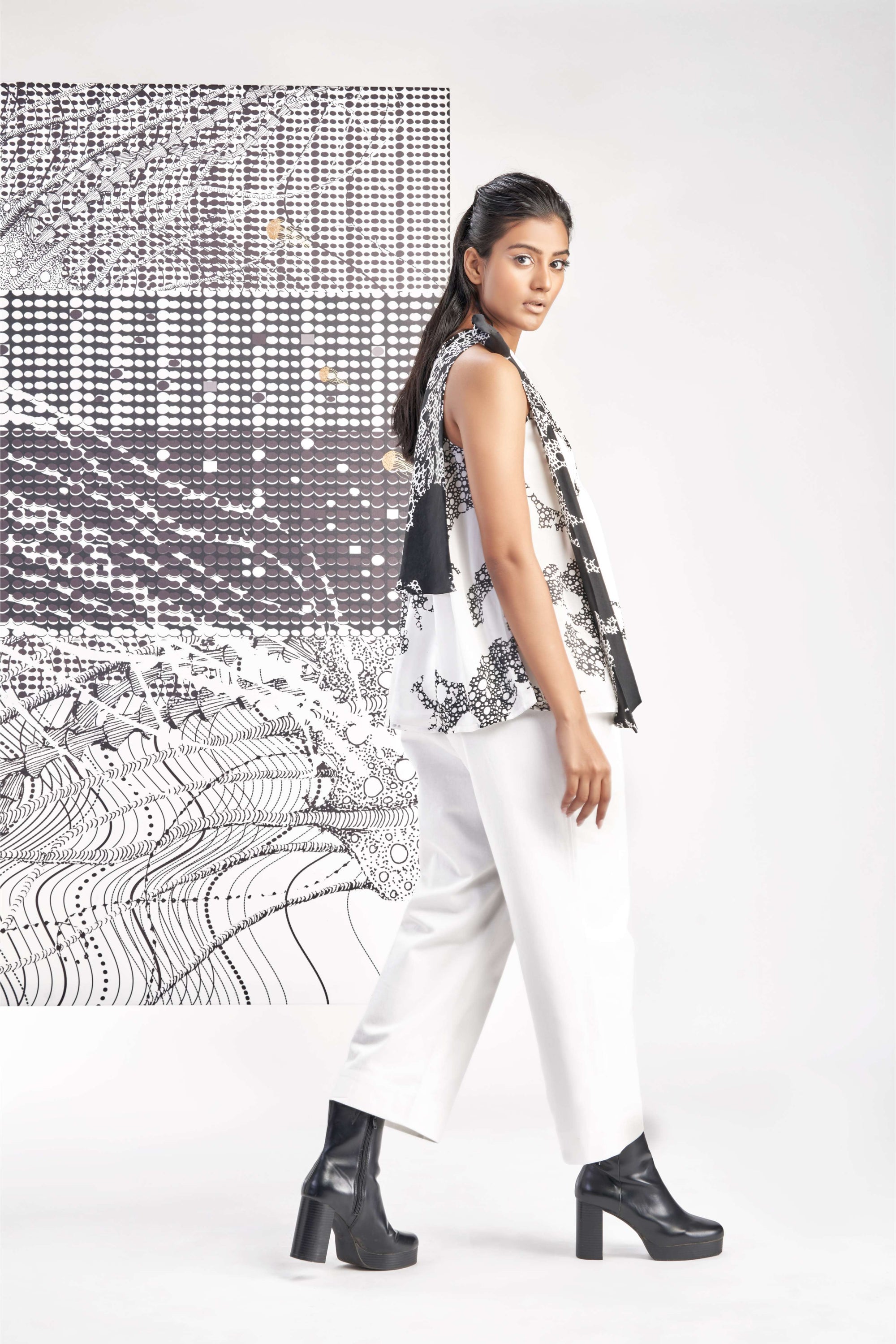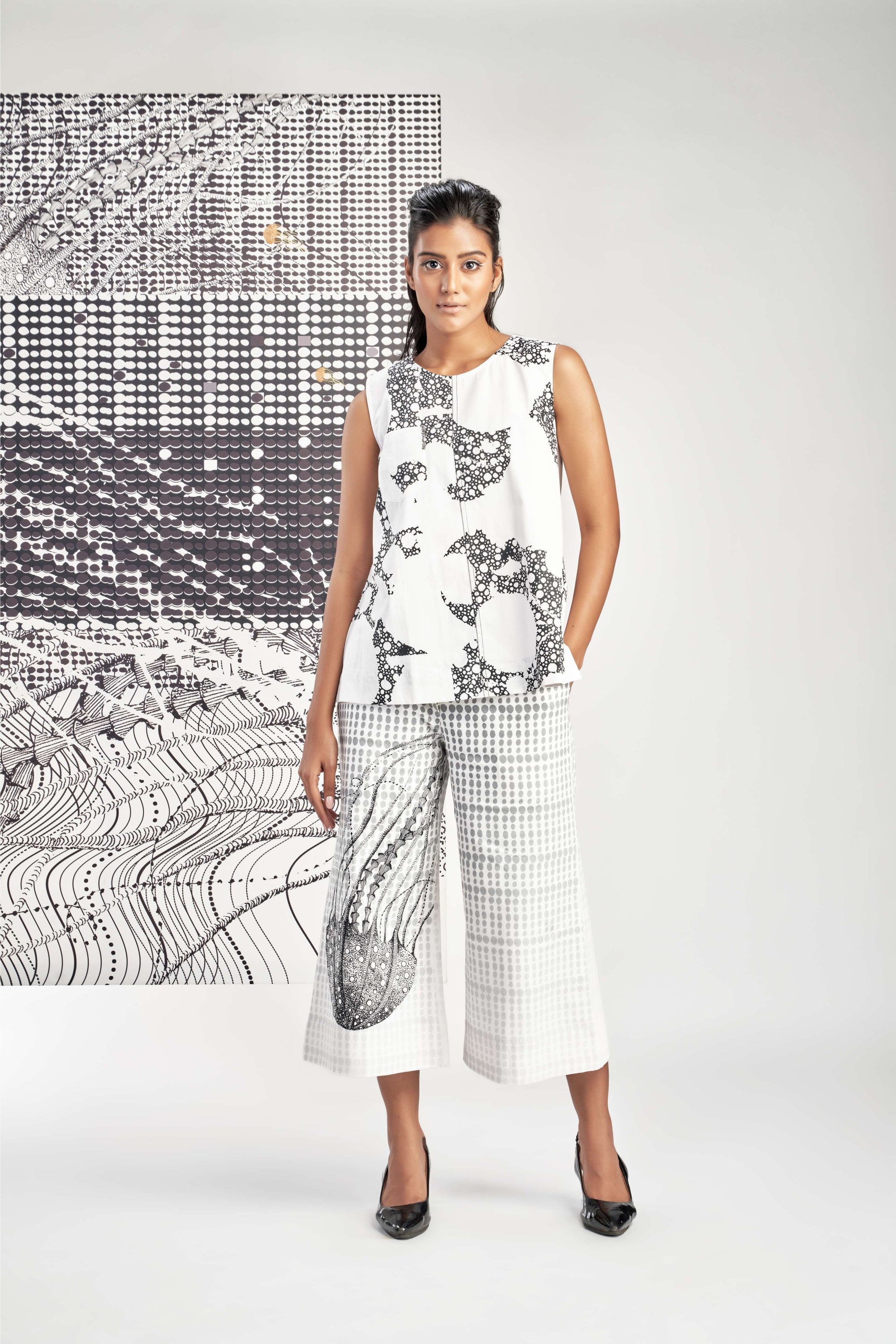 Black- Sleeveless Printed Pleated Top